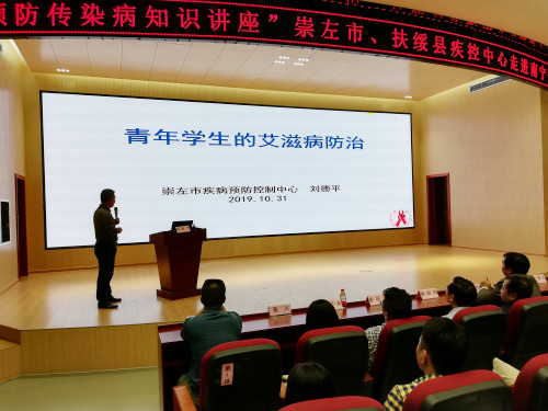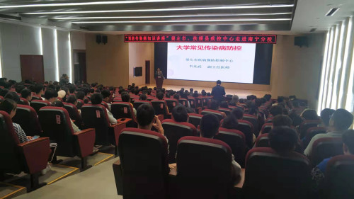 崇左市疾控中心主任韦光武作了“大学常见传染病防控”的知识讲座,介绍了传染病的分类、发生因素、表现形式、临床基本特征等,重点讲解了大学常见传染病的预防及学校传染病防控要点等内容。崇左市疾控中心副主任刘德平作了“青年学生的艾滋病防治”的知识讲座,主要讲解了艾滋病基本知识解读、艾滋病流行形势及特点、青年学生如何预防艾滋病等知识。