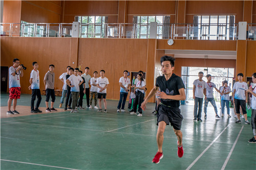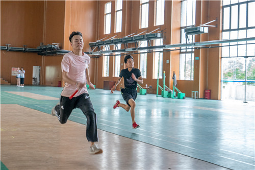 本次比赛为积分制形式,共有两个环节:晋级赛(16进7),决赛(7进3),分别以不同的形式要求参赛成员间在配合协作中完成。经过简单的比赛规则介绍后,随着裁判员的一声哨响,比赛正式开始。整个赛场顿时沸腾起来,加油助威声此起彼伏,络绎不绝。首先,经过跳大绳、立定跳远和颠球的角逐,参赛成员各展其能,选出晋级前七名宿舍进入决赛。最终,进入决赛的每间宿舍选出四名成员进行接力赛跑和齐鼻棍的比赛,两名成员参加仰卧起坐的比赛。赛场上选手们克服重重困难,携手互助完成了比赛。