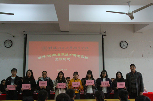 为帮助家庭经济困难学生顺利返乡,度过一个祥和团圆的春节和寒假,1月11日下午,分校在空港校区启智楼208教室举行了2018年寒假家庭经济困难学生返乡路费补助发放仪式。桂林理工大学学生工作处处长助理郑伟民老师、学生工作部主任韦宁照老师以及各系学工组长、辅导员代表和受助家庭经济困难学生共300多名师生参加。仪式由学生工作部副主任黄维老师主持。