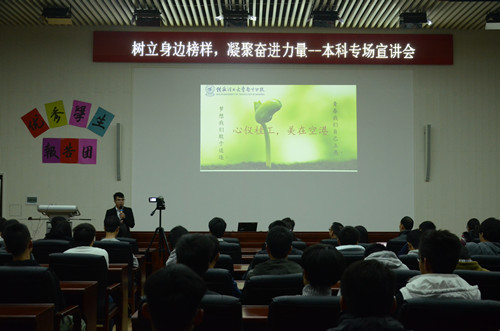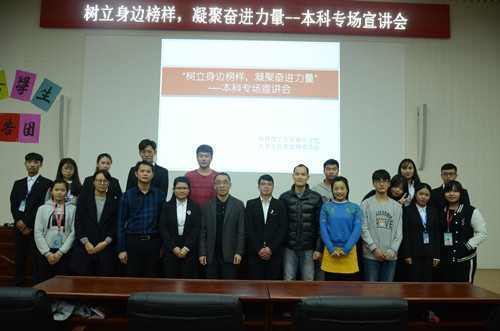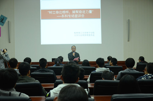 为加强学风建设,弘扬桂工精神,传递青春正能量,11月21日下午,分校在图书馆报告厅召开了以“树立身边榜样,凝聚奋进力量”为主题的本科专场宣讲会。分校党委副书记梁冬松,分校学生工作部和团委相关人员以及2017级全体本科学生到场共同聆听了宣讲会。