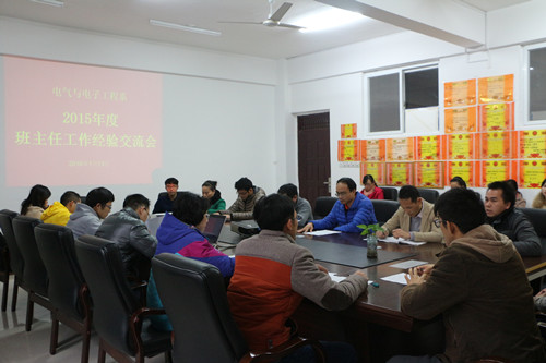 为加强系部班主任队伍建设,提升班主任工作水平,电气与电子工程系于1月13日在空港校区玉成楼208会议室召开2015年度班主任工作经验交流会,该系主任周红锴、党总支书记李培良、分校学工部副主任石有总出席会议,会议由该系党总支副书记甘锦琛主持。