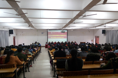 在仪式上,梁冬松副书记代表学校党委、行政对广大学生表示亲切问候和新年祝福。梁副书记指出,一直以来,学校坚持以学生为本的理念,十分关心广大学生的健康成长成才,并通过多种举措促进广大学生的全面发展,并向全校家庭经济困难的同学提出了三点殷切希望:一是要正视困难、自强不息,不丧失志向、自暴自弃;二是要珍惜时光,把国家和学校的关爱转化成内在动力,刻苦学习,努力提高自我,以优异成绩回报国家、社会、学校;三是学会感恩,报答家人,寒假返家后积极去做力所能及的事,减轻父母的压力和负担。梁副书记最后还亲切嘱咐同学们在返乡途中要注意安全,增强防范意识。