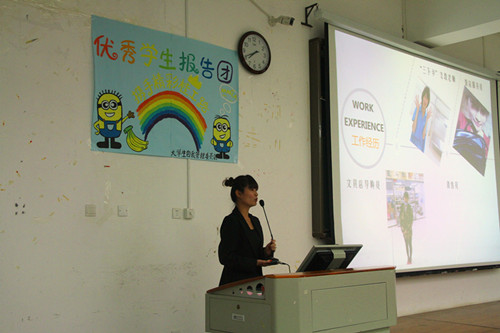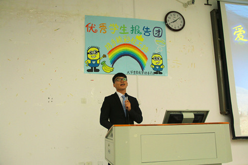 应各系学生的不要同求,报告团分派不同的成员到相应的教室做宣讲。他们精心准备,在宣讲中跟同学分享自己在平凡的大学生活中不平凡的生活态度和人生追求。来自地勘13-1班的张炎与同学畅谈如何兼顾理论学习与社会实践的经验,会计13-7的韦清任则给大家展示了“学霸”是如何养成的,国贸13-2的于冉冉则告诉大家怎么处理好学生干部工作与学习、生活三者之间的关系。此外,报告团成员中还有历经军旅锤炼的“自强之星”徐柳强、精通IT行业的实践能人陆固东、勇夺全国数模竞赛奖项的“科学狂人”颜森,同时也不乏来自校园“文艺界”的钟敏,校园足坛巨星张鸣等等。他们现场各具特色的大学生活经历分享,博得了同学们的阵阵掌声。宣讲过后,不少同学纷纷表示,学长学姐们乐观进取的大学生活态度深深地感染了他们。他们相信,传承与发扬这种优良的品质,自己未来也能拥有一段充实而有意义的大学生活。