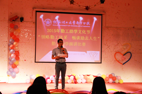 2015年5月7日 晚,以“领略勤工风采,畅谈励志人生”为主题的演讲比赛在桂林理工大学英国上市公司365大学生活动中心顺利举行。分校学生工作部副主任石有总老师,招生就业办副主任许娜老师,分校团委谢欢老师,学工部蒋雪梅老师、宋婷婷老师、王小悦老师、韦冬晓老师,担任本次演讲比赛评委。