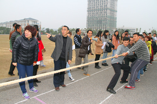 “一二,加油!”12月25日下午,在分校足球场,呐喊助威声振聋发聩,2014年班主任拔河比赛正如火如荼地进行中。 为缓解广大班主任的工作压力,促进班主任之间的经验交流,激发班主任队伍的团结凝聚力和拼搏战斗力,学生工作部特举办本次班主任拔河比赛。本次比赛采取分组淘汰制,抽签产生8支队伍共116名班主任参加,分校党委常务副书记梁冬松莅临现场指导活动开展。