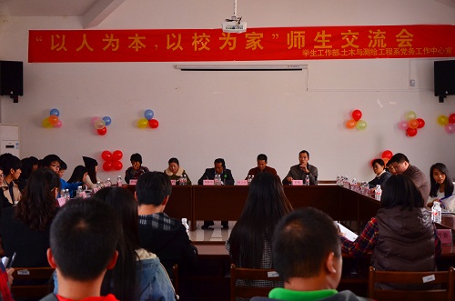 2014年12月4日下午,由学生工作部主办,土木与测绘工程系党务工作中心承办的“以人为本,以校为家”师生交流会在职工之家如期召开。与会人员分别有分校后勤管理部副主任唐文付、后勤管理部副主任郑春华、后勤管理部副主任韦松吟、物业公司主任赖成霞、系部及后勤其他老师代表、各系及各主要学生团体学生代表。