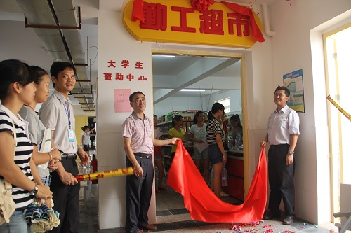 王文院长(右一)、梁冬松常务副书记(右二)为勤工超市揭牌