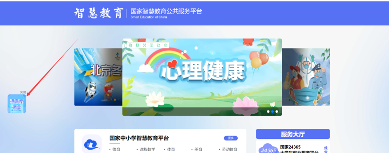 本次调研采取匿名形式,请各单位、部门组织本单位人员打开国家智慧教育公共服务平台(网址: www.smartedu.cn),点击首页左边的悬挂窗口参与调查。