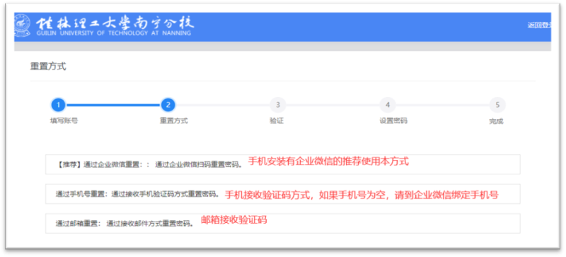 3、选择重置密码的方式:推荐通过企业微信扫描重置,如采用短信重置,同时手机号为空,请到企业微信先绑定手机号再采用短信重置方式,由于存在数据交换延迟,短信重置方式不能立即使用。