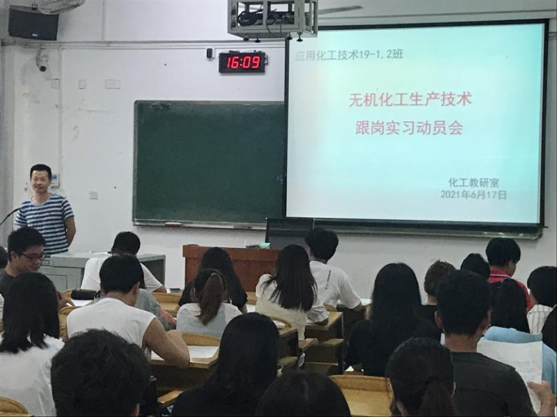 6月18日下午,我系在6203教室召开化工19-1、2班跟岗实习动员会。化工教研室部分老师、实习指导老师及化工19-1、2班全体同学参加了会议。