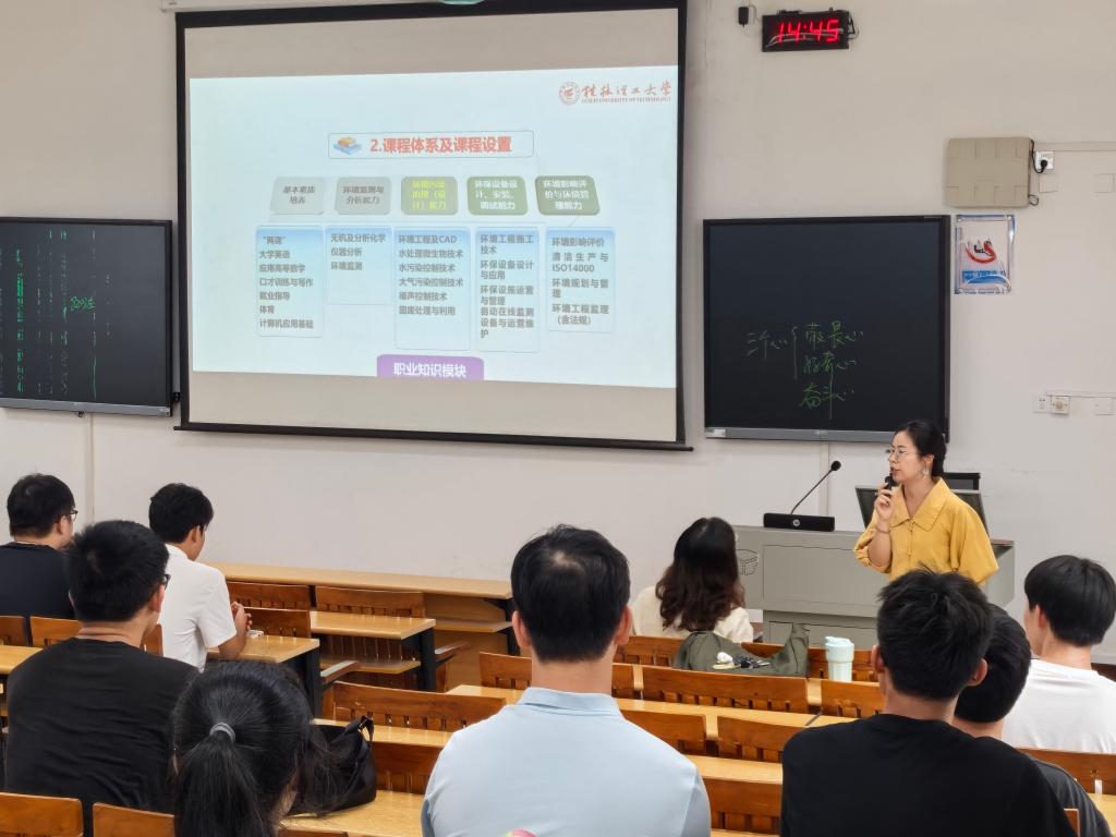 本次活动分专业同步进行。资源循环科学与工程专业由周龙老师主讲,环境工程技术专业由陆燕青老师负责。两位老师围绕各自专业的整体概况、师资力量、教学条件、课程结构、培养目标与模式、就业方向以及未来发展路径等内容,为新生做了系统而深入的介绍,并寄语同学们珍惜大学时光、夯实专业基础、明确发展方向。