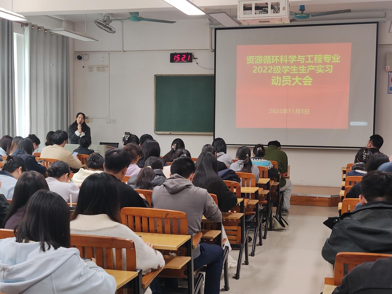 11月5日上午,资源循环科学与工程专业2022级3、4班在探源楼5205教室召开生产实习动员大会。学院党委副书记、学工组长方艳出席会议,带队教师黄文富、于润参加。