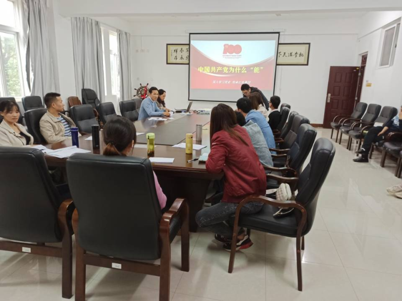 在“深入学习党史•传承红色基因”主题党日活动中,党员教师们围绕中国共产党为什么“能”进行交流