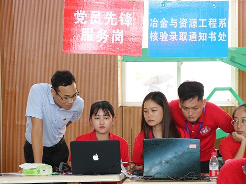9月8日,在忙碌而有序的迎新现场,一群身穿红色系服,胸前佩戴着“党徽”的志愿者,他们是冶金与资源工程系的学生党员。在迎新工作中,学生党员志愿者们尽心尽力为新同学们提供了细心、周到、温馨的帮助。