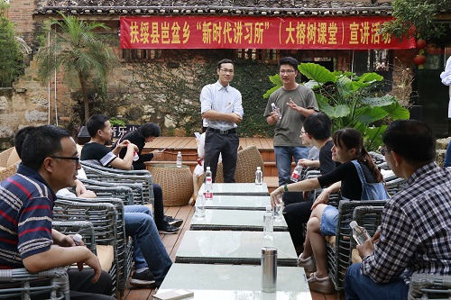 随后派驻该屯的工作人员带领大家参观了屯里的“大寨”——70年代屯里统一规划建设的民居被改造成了现在的休闲场所,姑辽书屋书籍琳琅满目,茶室优雅别致,音乐室有吉他、鼓架,花园餐厅浪漫温馨,俨然已成为屯里一道独特的乡村旅游亮点。工作人员在花园餐厅向大家简要介绍了姑辽屯通过招商引资建成的游客接待中心、姑辽乡土文创中心、亲子广场、农耕文化广场、荷竹岛、景观台、亲水栈道、垂钓场、田园烧烤场等旅游景观、景点建设情况。工作人员还介绍了该屯通过招商引资开展乡村旅游建设、引入广西百悦山泉水业有限公司开发饮用水包装等促进农民收入得到极大提高。