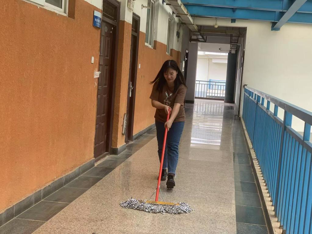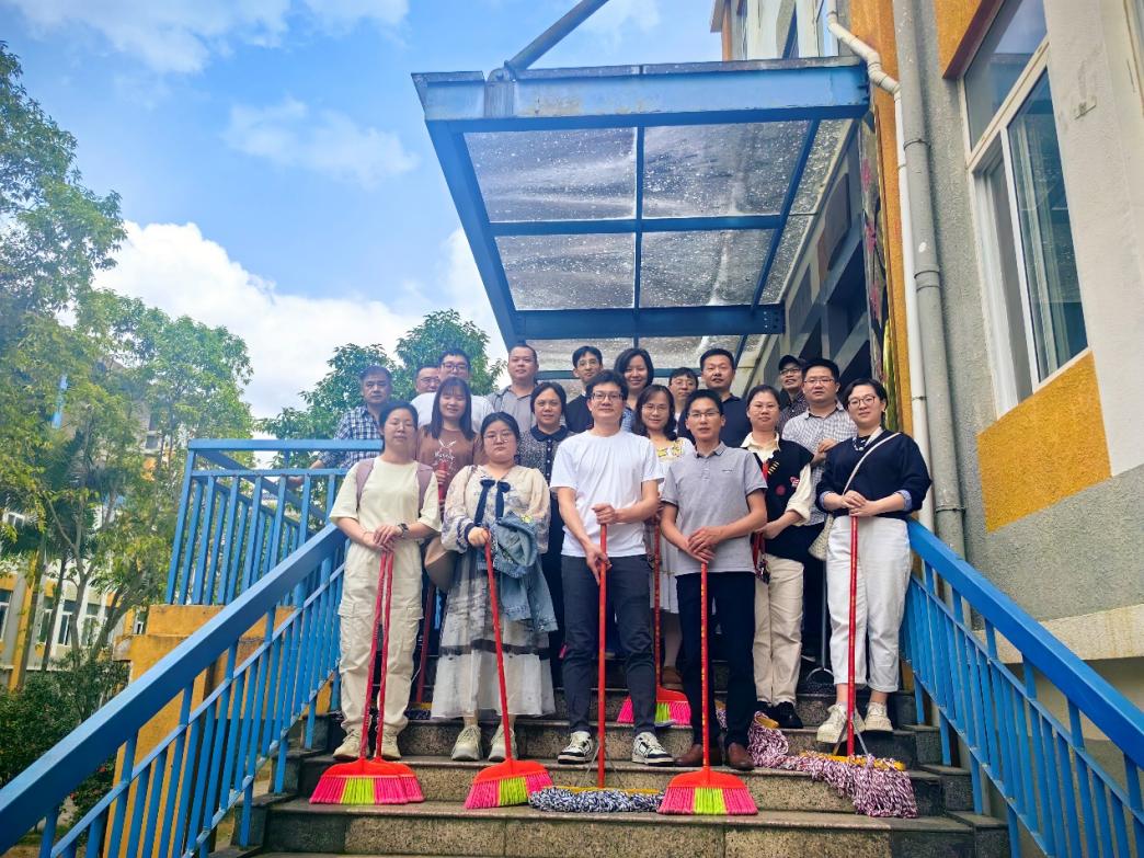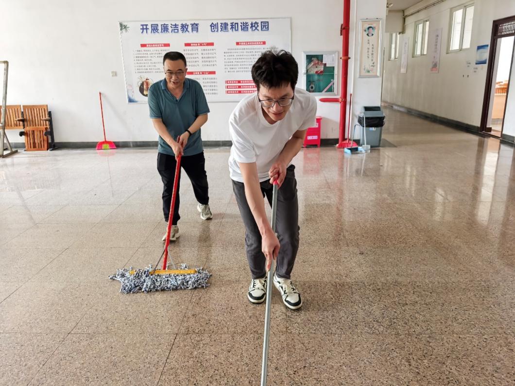 下午2时30分,支部全体党员佩戴党员徽章,自带扫帚、拖把等清洁工具在5号教学楼前集合开工。党员教师们重点清理了教室地面顽固污渍、擦拭多媒体设备积尘、整理走廊,并对卫生间、楼梯扶手等公共区域进行深度清洁。经过两个多小时劳动,五号教学楼门窗明亮、桌椅整齐,教学环境焕然一新。