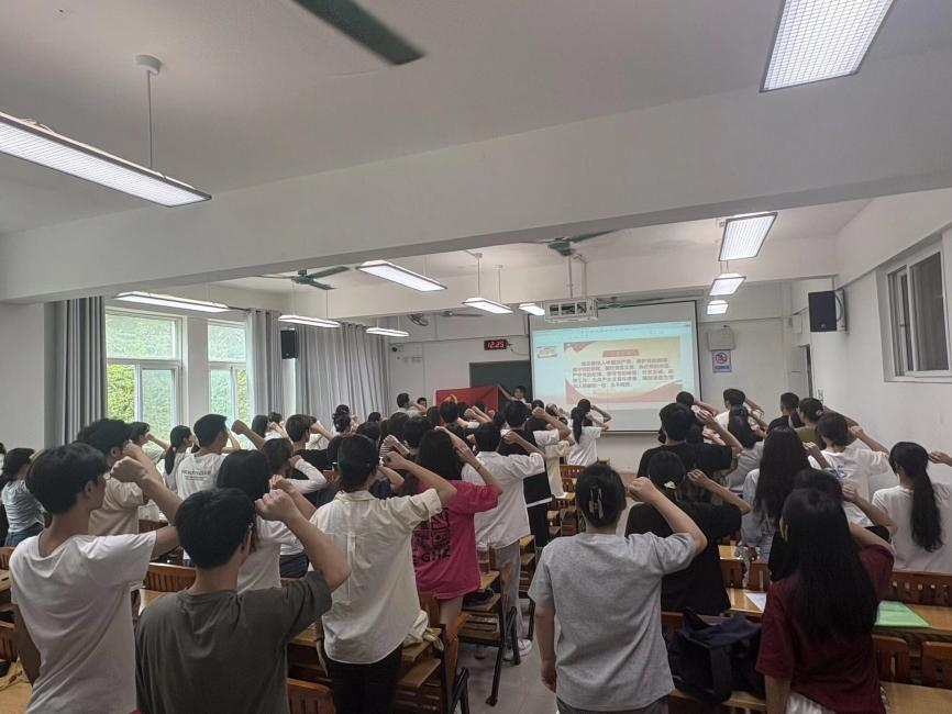 紧接着,学生第三党支部书记支部书记潘显鹏同志带领全体学生党员及入党积极分子举行重温入党誓词仪式。“我志愿加入中国共产党,拥护党的纲领,遵守党的章程……”铿锵有力的誓言回荡在党旗下,全体师生党员面向党旗肃立,眼神坚定,神情庄重。通过重温入党誓词,党员们回望入党初心,进一步强化“为人民服务”的使命担当,入党积极分子也深受感染,更坚定了向党组织靠拢的决心。