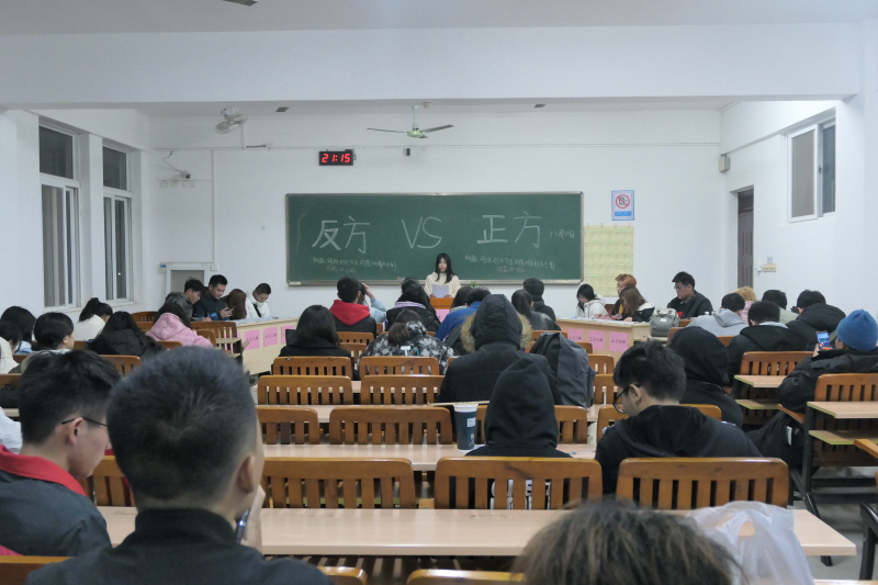 本次竞赛与预赛规则相同的,两两一组进行班级间的辩论,各组辩手紧抓对方的漏洞,据理力争,为进击决赛而努力,参赛班级也积极到场为班级代表队加油打气。