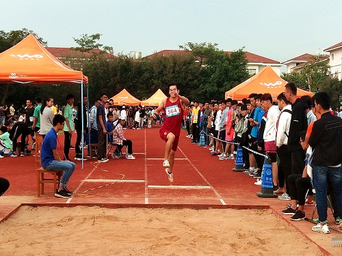 11月9日上午,男子组三级跳决赛在田径场跳远场举行,我系运动健儿黄汉斩获冠军,卫冕成功。以“卫冕”身份参赛的黄汉比赛过程中信心满满,助跑、加速,然后纵身一跳,整套动作连贯有力,最后以12.12米的佳绩斩获本届运动会男子组三级跳总冠军。黄汉超越自己、突破自己,连续两届运动会为我系赢得了荣誉。