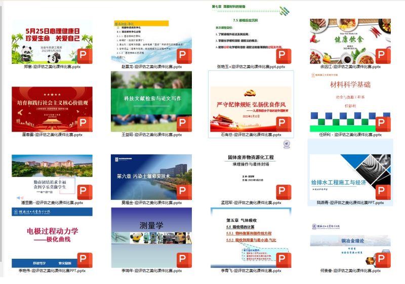 本次比赛得到了老师们的积极参与,大家结合自己的教学内容、教学风格,精心制作了教学课件,既涵盖课程的主要知识点,并注重美观、简洁、易懂。经过评比,最终评出了一等奖作品3名,二等奖作品5名,三等奖作品8名。