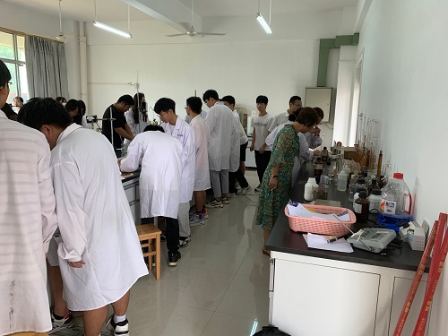 何贵香和石有总认真查看学生实验操作
