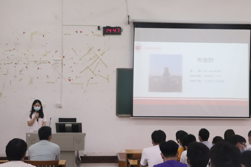 会上,今年成功考上桂林理工大学研究生的岑金妙同学、考上华北电力大学研究生的毛百海同学为2019级本科学生分别分享了自身备战考研感悟,对考研中常见问题进行了回答,并鼓励学弟学妹们在考研中奋斗,在考研中提升自己,在考研中实现自己的人生理想。