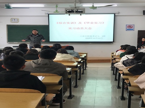 12月11日上午,我系在6310D教室召开了2017级工业分析技术专业毕业生实习动员大会。系副主任王军正、分析检验教研室主任暴玮及实习指导老师、辅导员和2017级工业分析技术专业全体学生参加了动员会。会议由教研室暴玮主任主持。