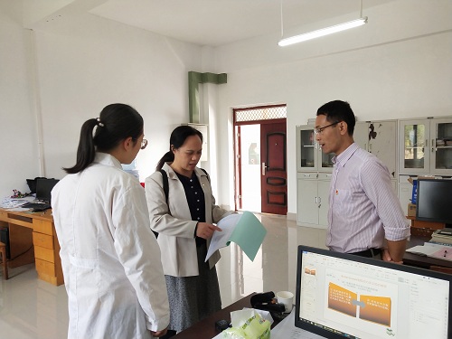 何贵香主任(中)和石有总书记(右)检查实验室管理台账