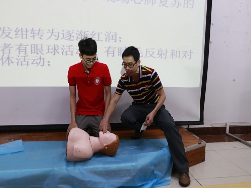 校医务室梁维徳老师指导学生进行心肺复苏实操训练