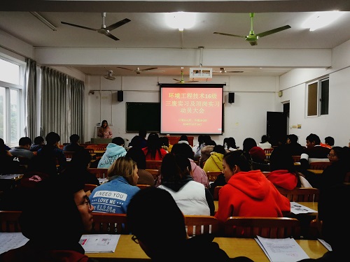 为帮助学生对实习形成正确认识,端正实习态度,强化安全意识,顺利完成实习任务,12月14日下午,环境工程技术专业在上善楼1305教室召开实习动员会。系主任何贵香应邀参加,并作实习动员讲话,环境保护教研室全体教师以及环境工程技术2016-1、2班全体学生参加了动员会。动员会由教研室主任梁宁主持。