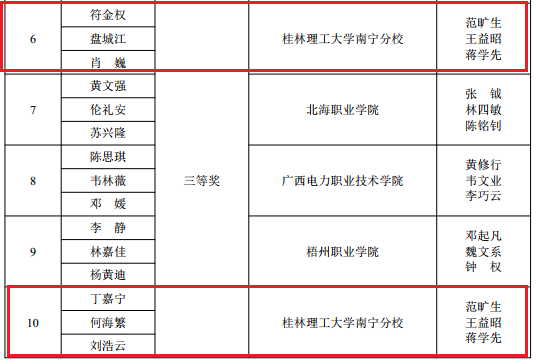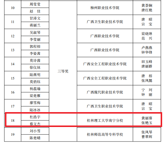 日前,自治区教育厅公布了2024年广西职业院校技能大赛获奖名单,我院获得了4个奖项,其中新材料智能生产与检测、食品安全与质量检测赛项团体三等奖3项,化学实验技术赛项个人三等奖1项。