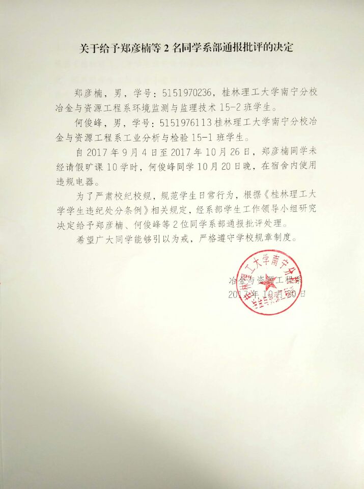 关于给予郑彦楠等2名同学系部通报批评的决定