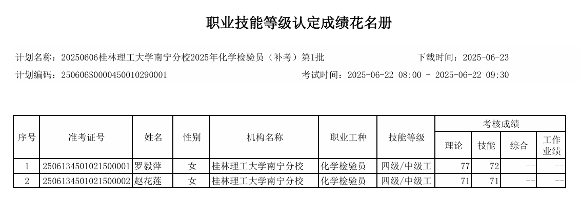 根据《广西壮族自治区人力资源和社会保障厅关于开展社会培训评价组织职业技能等级认定试点工作的通知》(桂人社函(2020)203 号)等有关文件要求,为确保职业技能等级认定的公平公正,现对我院2025年6月22日进行的2025年化学检验员(补考)第1批等级认定考试成绩予以公示。本批次认定共2人,合格2人。公示期为本公示发布之日起5个工作日:2025年6月23日—6月27日。