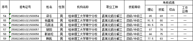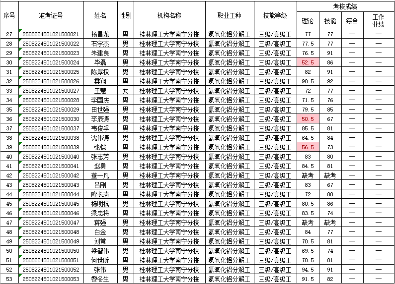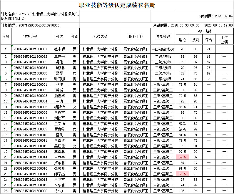 根据《广西壮族自治区人力资源和社会保障厅关于开展社会培训评价组织职业技能等级认定试点工作的通知》(桂人社函(2020)203号)等有关文件要求,为确保职业技能等级认定的公平公正,现对我院2025年8月30—31日进行的氢氧化铝分解工职业技能等级认定考试成绩予以公示。本批次认定共59人,合格50人。公示期为本公示发布之日起5个工作日:2025年9月8日—2025年9月12日。