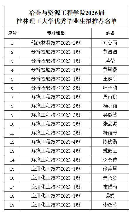 根据《关于做好2026届桂林理工大学优秀毕业生评选工作的通知》的文件精神,我院组织开展了2026届桂林理工大学优秀毕业生评选工作。经2026届毕业生个人申请,学院对照优秀毕业生评选条件、结合毕业生在校综合表现,对申请者进行了综合审议,共评出了35位毕业生为2026届桂林理工大学优秀毕业生拟推荐人选。现将拟推荐人选情况在全系范围内进行公示,公示期为3月20日—3月24日,公示期为3个工作日。